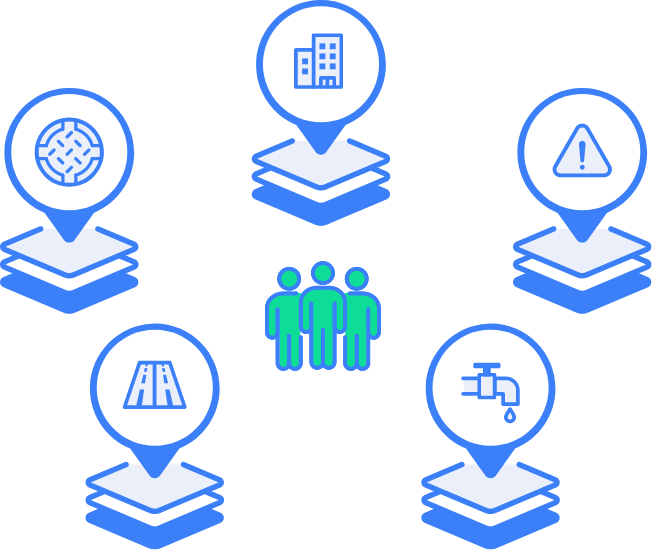 道路台帳、上下水道、固定資産、都市計画、防災情報など、複数部署が保有する地理情報を庁内で一元的に閲覧・検索・更新することができ、日常業務から災害対応まで幅広く活用されています。