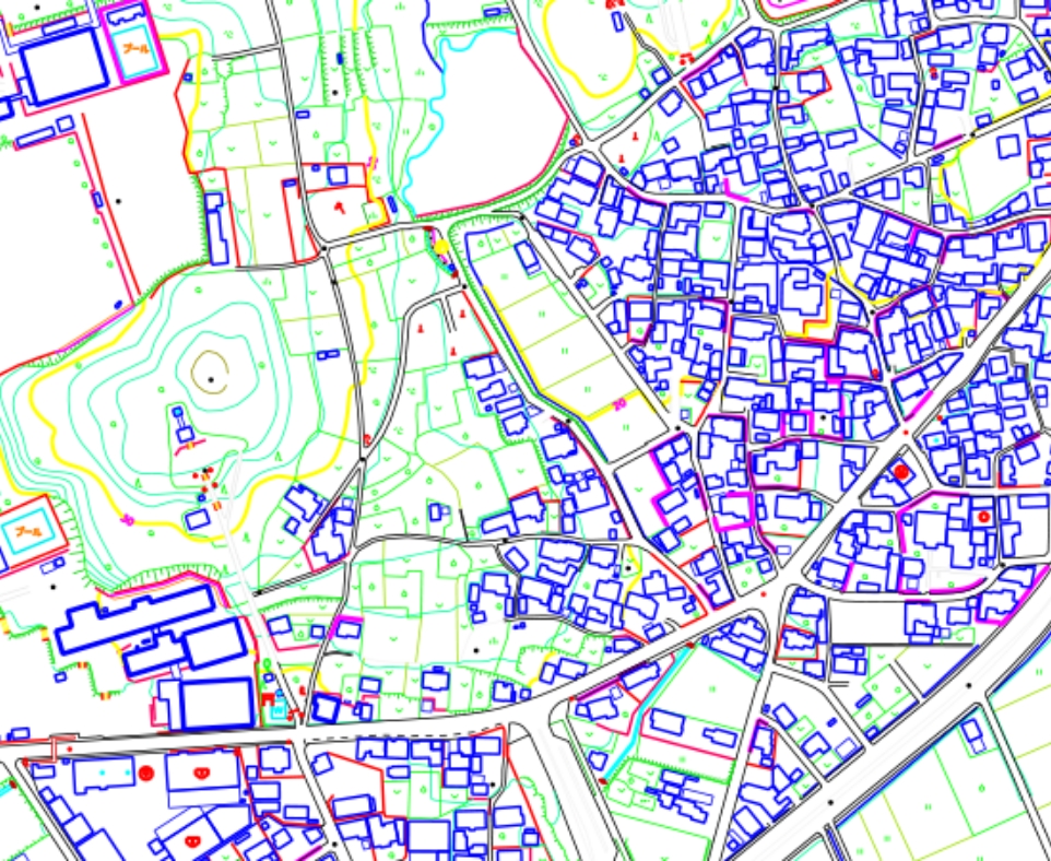 空中写真をデジタル図化機に取り込み、地形・地物を地図情報としてデジタル形式で取得し、数値地形図を作成します。この数値地形図は、GIS(地理情報システム)の基盤情報、都市計画や各種台帳業務の背景などに幅広く利用可能な非常に重要なデジタル情報となります。中測技研では、長年の経験で培ったノウハウを基にお客様の利用目的にあわせた様々な用途・縮尺の地図を2次元または3次元で作成しています。