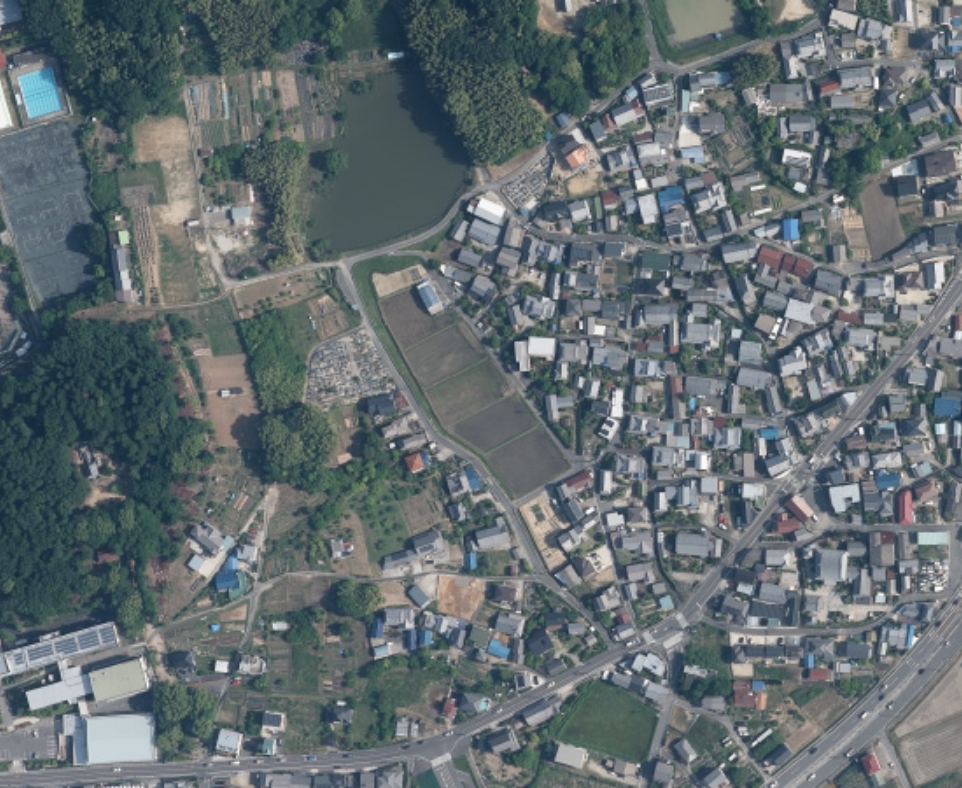 デジタルオルソは、空中写真を数値化(スキャナ画像化)、又はデジタル航空カメラで撮影した数値写真を、正射投影したデジタル画像です。航空カメラで撮影した空中写真では、レンズの中心から対象物までの距離の違いや土地の起伏により、写真上の像の位置のずれや歪みが生じていますが、オルソフォトでは、これらが補正され、写真のどこにおいても真上から見たような正しい大きさと位置に表示される画像になっています。高い精度で位置情報を保持した空中写真を作成することにより、画像上で位置、面積及び距離などを正確に計測することが可能で、都市計画等の 大縮尺地図と重ね合わせ、自治体GISのベースマップとして活用できます。